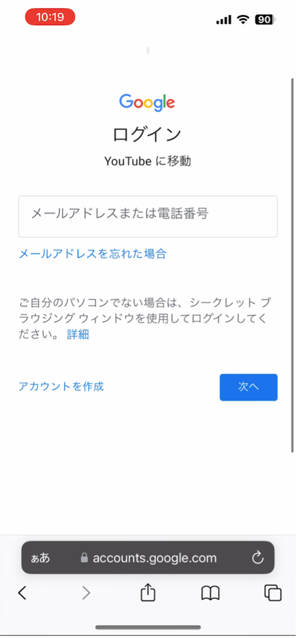 するとメールアドレス等の入力ができますので、ご自身のYouTubeチャンネルを登録したメールアドレスにてログインします。