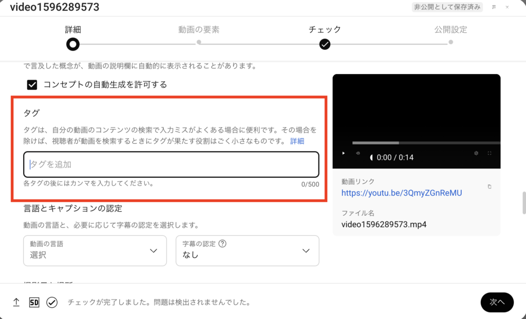 タグは動画の説明欄ではなく、タグ欄に入力します。