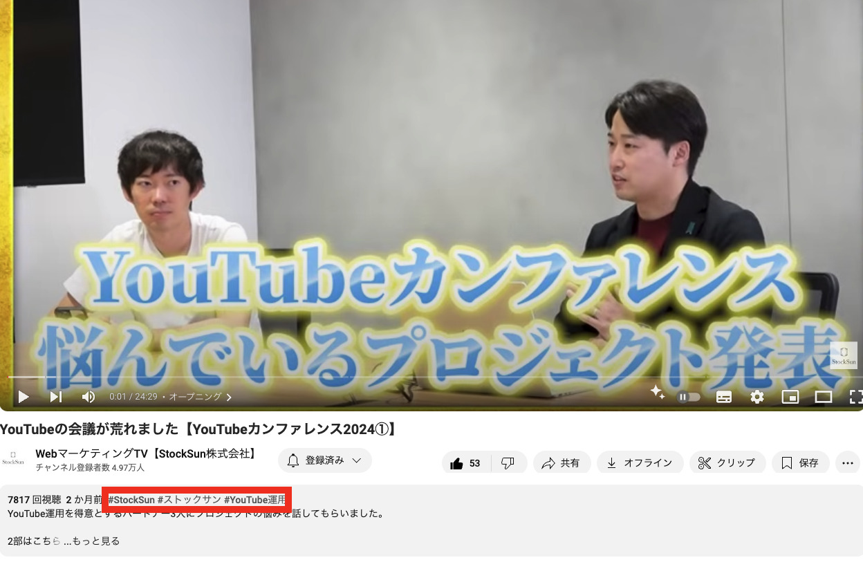 YouTubeの会議が荒れました【YouTubeカンファレンス2024①】の動画で設定しているハッシュタグは「#StockSun #ストックサン #YouTube運用」です。