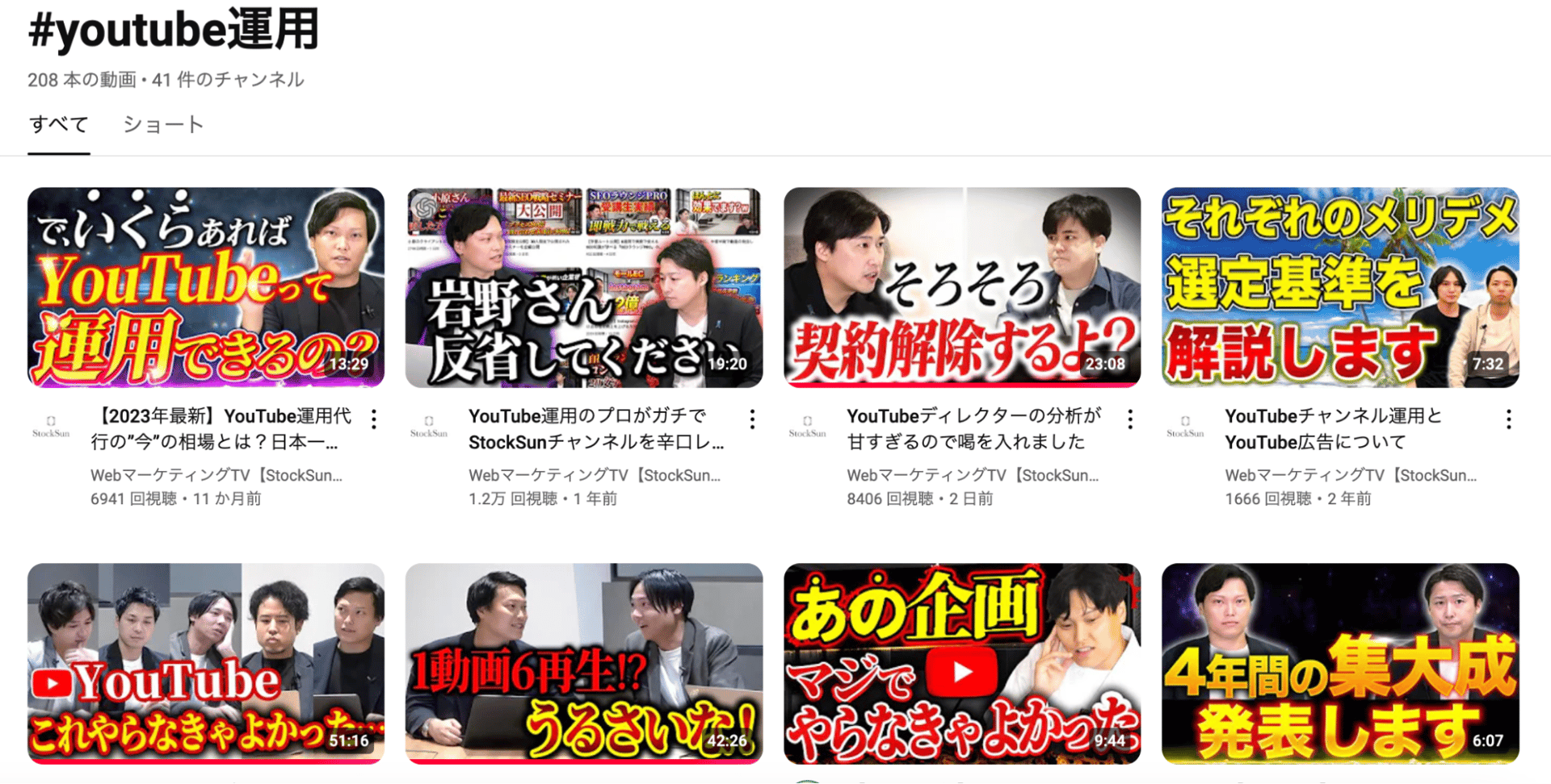 「#YouTube運用」を選ぶと、以下のように同じハッシュタグで設定した関連動画が一覧で表示されます。
