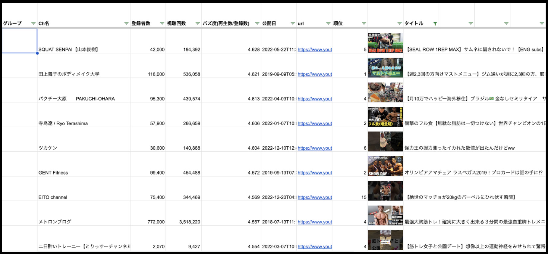 私自身フィットネスチャンネルを行っているので、フィットネスジャンルで例に上げると、下記のように競合チャンネルの上位再生20個の、視聴回数/公開日/バズ度(登録者に対する再生数の数値)を全て網羅的に出したシートを作成して、参考となる企画を探しています。