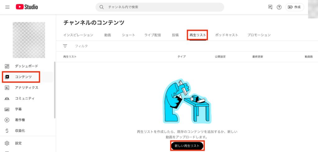 「YouTube Studio」からコンテンツ>再生リストを選択します。再生リストには、再生リストの一覧が表示されます。