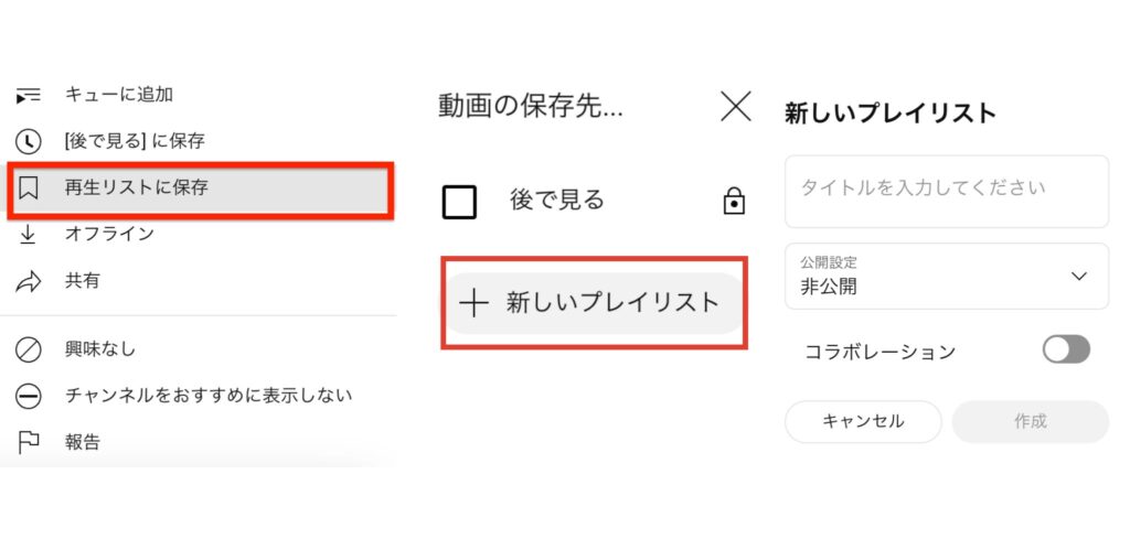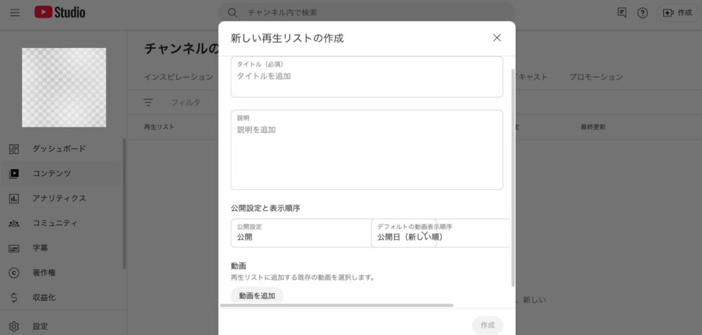 タイトル名や公開設定(任意)を入れて「作成」をクリックします。これで新しい再生リストが作成され、選択した動画が自動的に追加されます。