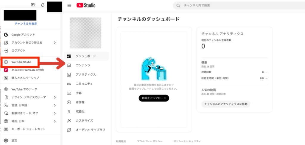表示されるメニューから「YouTube Studio」を選択すると、管理画面が表示されます。このダッシュボードから、チャンネルに関する設定や管理が可能です。