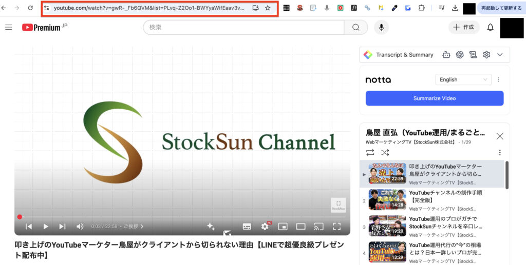 例えば、StockSun株式会社が運営している「WebマーケティングTV」では、人物やサービス、コンテンツごとに再生リストを作成しています。興味のある再生リストを選ぶと、関連コンテンツを一気見できるため、チャンネル全体の再生数向上に効果的です。