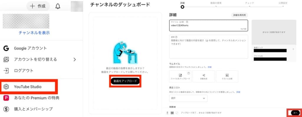 YouTube Studioの画面左上にある「作成」ボタンをクリックし、表示されるメニューから「動画をアップロード」を選択します。アップロードする動画ファイルを選んでください。