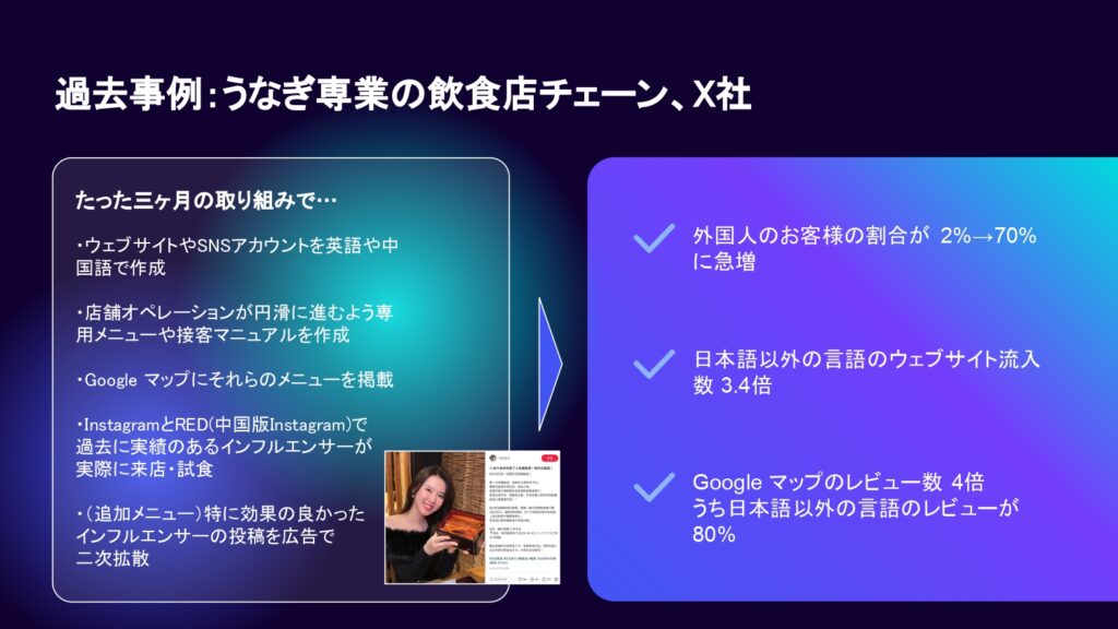 先方のビジネスモデルや現場のオペレーションを把握した上で、インバウンドのお客様がとりうる導線において、ストレスのかからない情報提供をできる状態を構築しました。導線が整い次第、日本在住で英語や中国でコンテンツを発信しているインフルエンサーとのタイアップを仕掛け、集客を行いました。