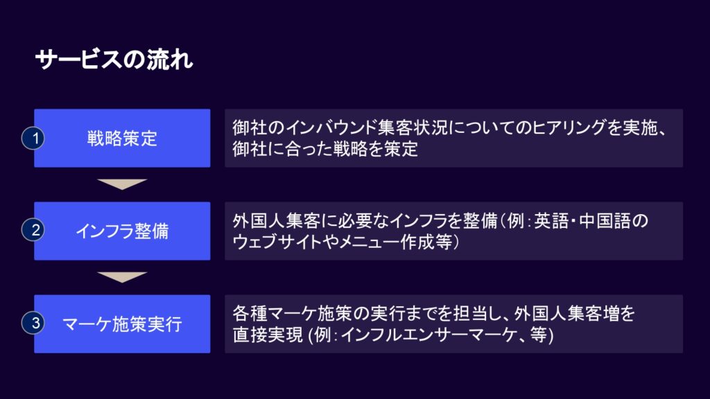 情報のインフラであるウェブサイトやメニューの多言語化とマーケティング施策の両方が噛み合うことで、施策の成功確率が上がります。お客様のビジネスモデルをお伺いした上で、必要なアクションを要件定義し、実行まで一貫して行います。