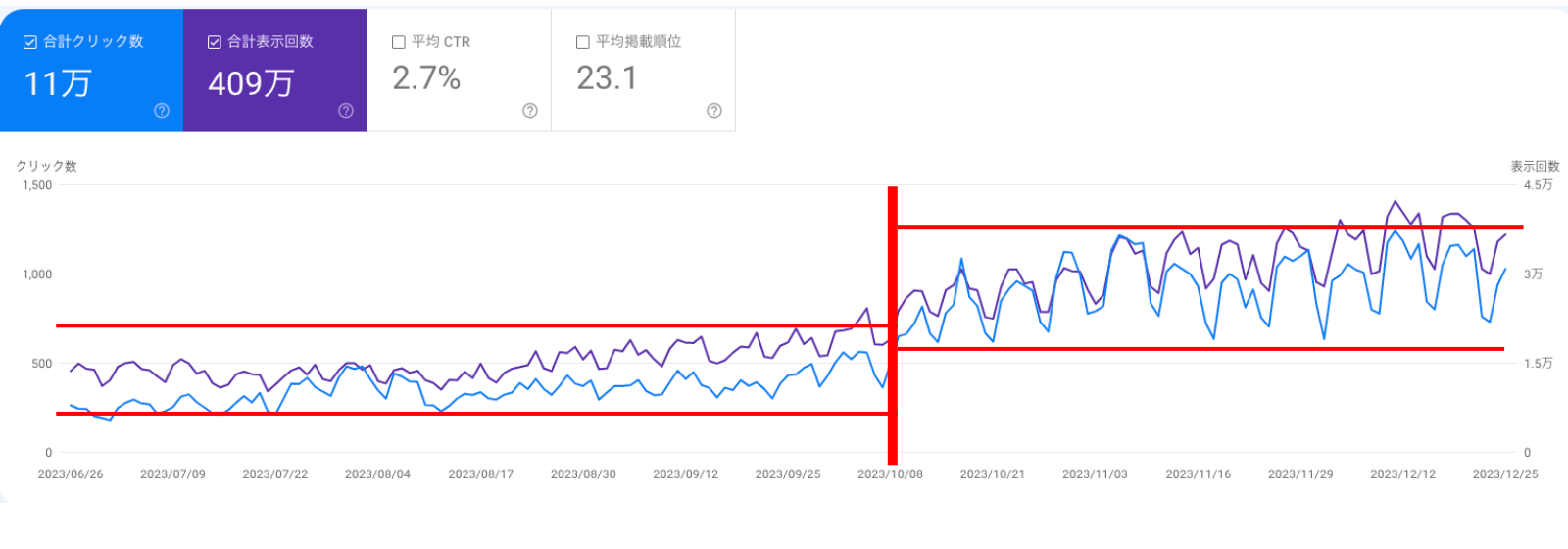 下記のように内部SEOを改善したタイミングでサイト全体の水準が2倍近く向上している