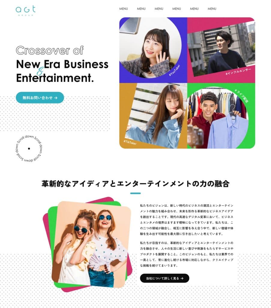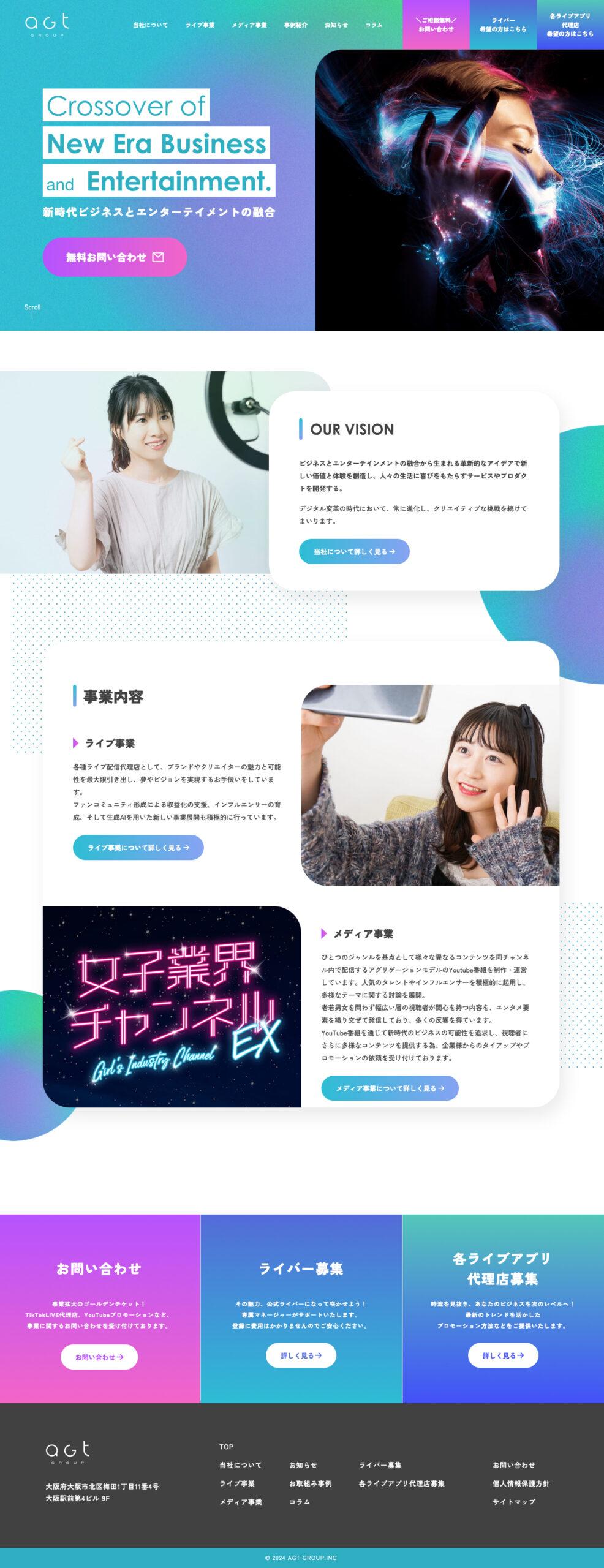 ライバーマネジメントやメディアプロモーションをおこなっている株式会社AGT GROUP様のサイト制作を担当しました。自社のコンセプトやサービス内容をわかりやすく伝えるコンテンツ設計はもちろんのこと、クリエイティブが重要な事業内容を表現するデザインを目指しました。
