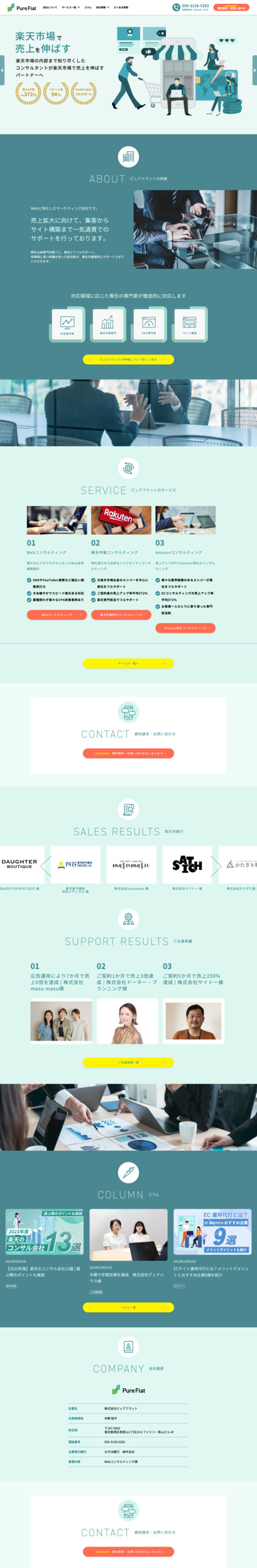 総合Webコンサル会社であるピュアフラット様のサイト制作を担当しました。楽天やAmazonといったEC領域を中心としたSEO流入を念頭に、認知の薄いユーザーにも伝わりやすいコンテンツや導線の設計を提案しました。