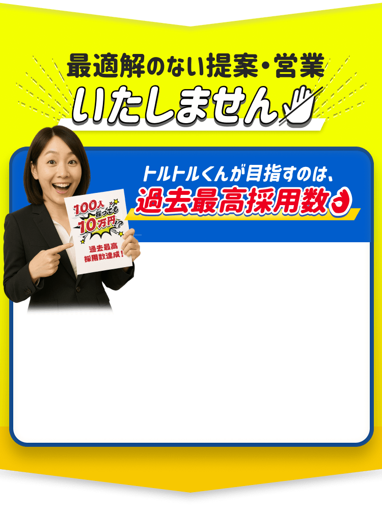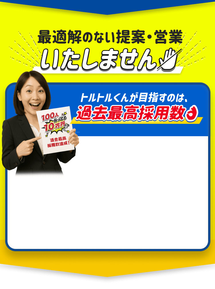 必須 担当者名 必須 会社名 必須 電話番号 必須 メールアドレス 任意 ご相談内容 任意 当サービスをどこで知りましたか? __none__Google広告Meta(Instagram / Facebook)広告知人からの紹介展示会・セミナーオウンドメディア(ブログ・記事)検索エンジン(Google、Yahoo!など)YouTubeその他 その他の場合は下記もご記入ください。 プライバシーポリシーをご一読いただき、お問い合わせへ進んでください。 コミュニケーションはどのように取りますか? Chatwork、LINEなど、お客様の使いやすいチャットツールに合わせて対応いたします。 途中でプランを変更することは可能でしょうか? 採用目標に合わせたプランに変更することが可能です。フロント担当にご相談くださいませ。 必ず人材を採用できる保証はありますか? サービスの特質上、保証をすることはできかねます。しかし最大限獲得できるよう、施策を実施いたしますので、ご安心ください。 成果報酬でご依頼することは可能でしょうか? 成果報酬でのご支援はできかねます。トルトルくん支援期間終了後、ご条件によってはお取り組み可能です。